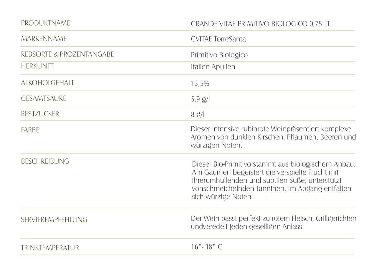 Torresanta Primitivo wird aus biologischem Anbau angebaut und bietet komplexe Aromen von dunklen Kirschen, Pflaumen, Beeren und würzigen Noten.